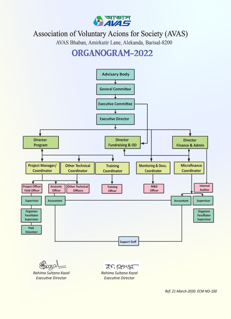 Association of Voluntary Actions for Society (AVAS) follows a transparent, participatory, and accountable governance system to ensure effective decision-making and responsible program implementation. The governance structure reflects the organization’s commitment to inclusiveness, gender balance, and representation of marginalized communities.